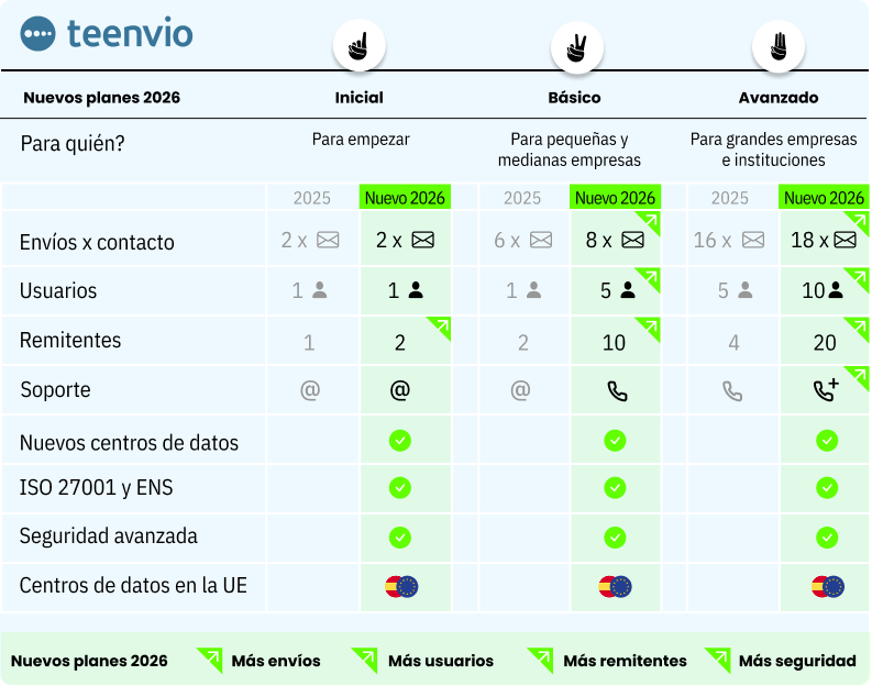 ¡Nuevos planes de email marketing 2026! Aumentamos la capacidad de envíos, remitentes y usuarios. Certificación ISO 27001, Esquema Nacional de Seguridad y centros de datos en España para llevar tu comunicación al siguiente nivel.